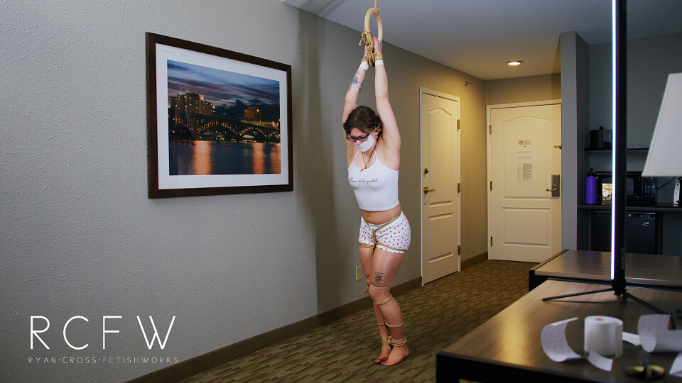 This hotel room... Not so great. The one nice thing it did have as a second level which allowed me to take Salem and stretch her out. She ends up dancing (and then wiggling once her legs are tied) on her pantyhosed toes.